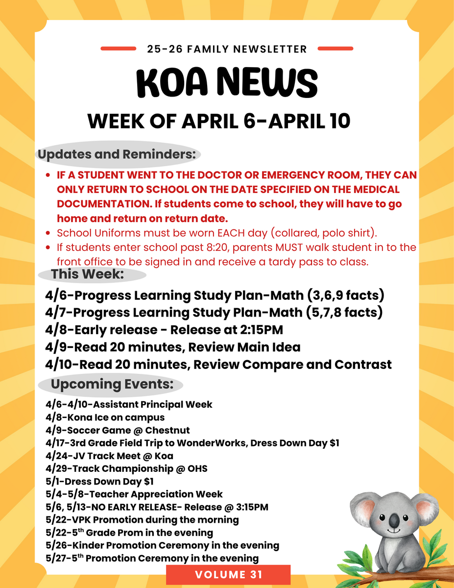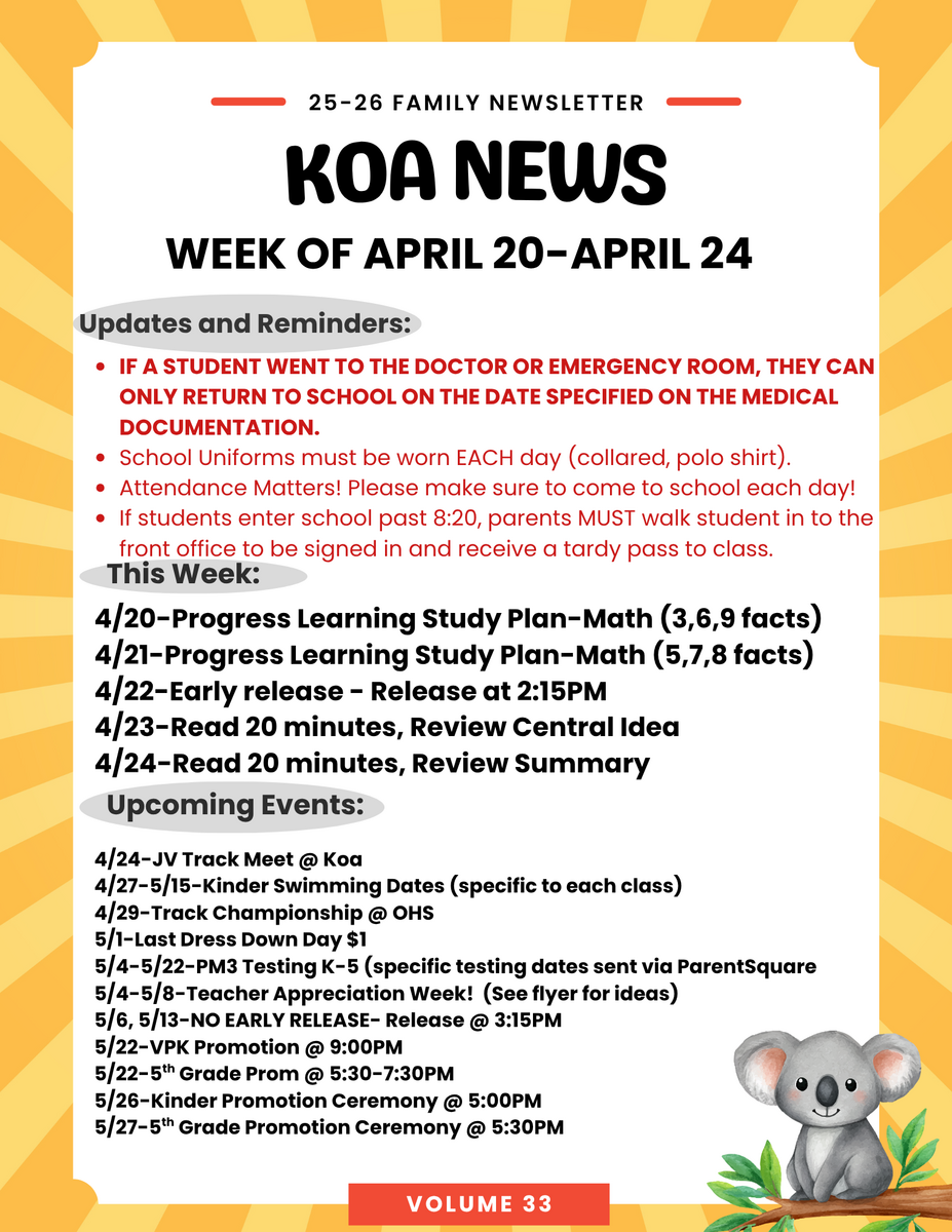 We kindly ask our families to continue reviewing math, reading, and science skills and strategies at home. Engaging in Progress Learning, practicing foundational skills, and having conversations about what students are learning in class makes a tremendous difference. Your partnership helps our Koalas grow with confidence.